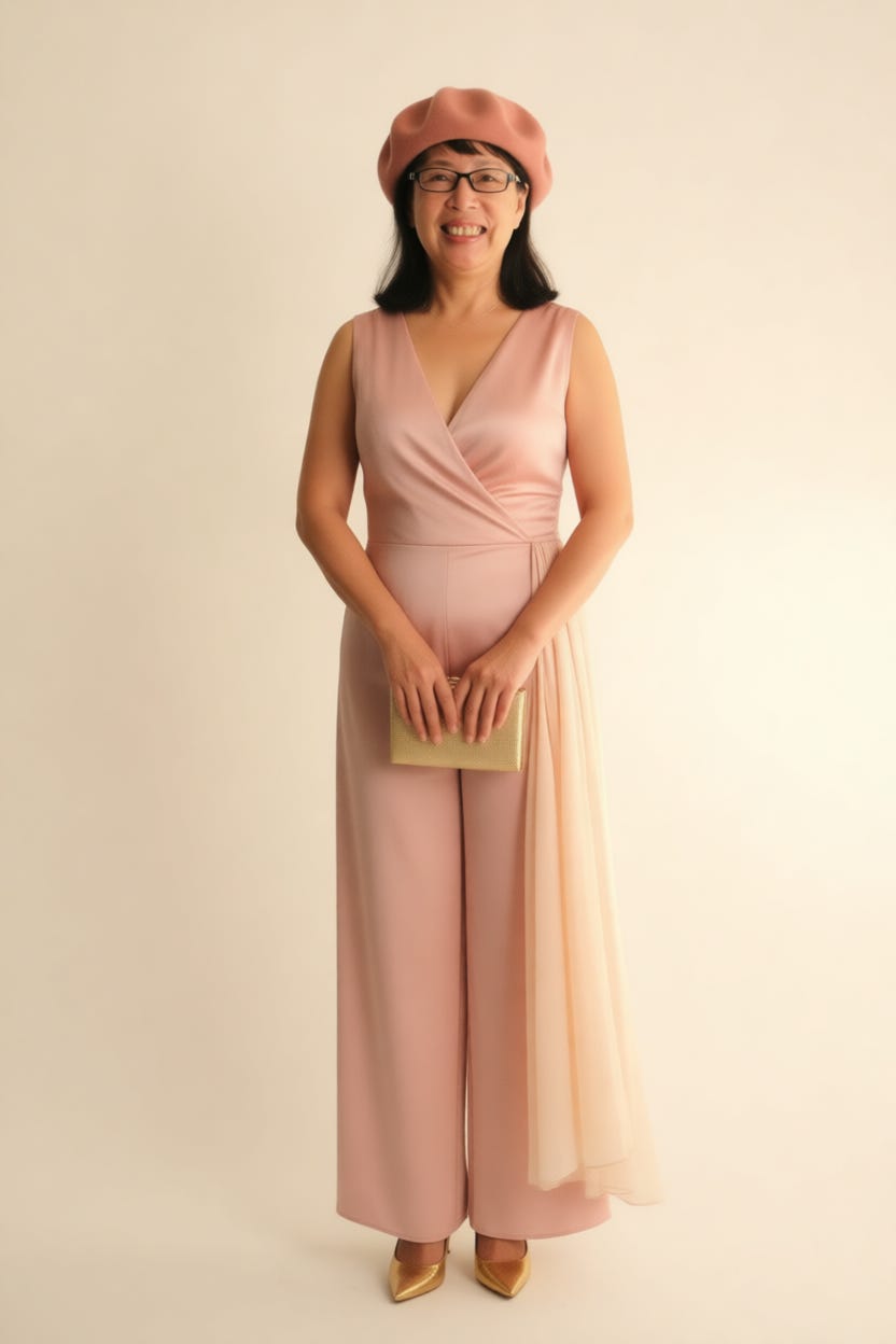 將女士的穿著風格變更為:展現出優雅與時尚的氣質,具體描述如下: 上身:她穿著一件無袖深V領連身衣,這種設計突顯了她的脖部和肩膀,增添了女性的柔美感。衣服的質地看起來非常柔軟、光滑,呈現出自然的光澤感,增添了高貴感。 下身:搭配一條寬鬆款式的褲子,從腰部到腳踝處流暢下垂,展現出流動的感覺,優雅且具有現代感。 細節:褲子一側的設計帶有輕盈的飄逸感,增添了動感與浪漫。她手持一個簡約的小型金色手包,整體配件也十分低調、精緻,與整體服裝相得益彰。 鞋子:穿著金色高跟鞋,增添了整體的精緻感,同時提升身形。