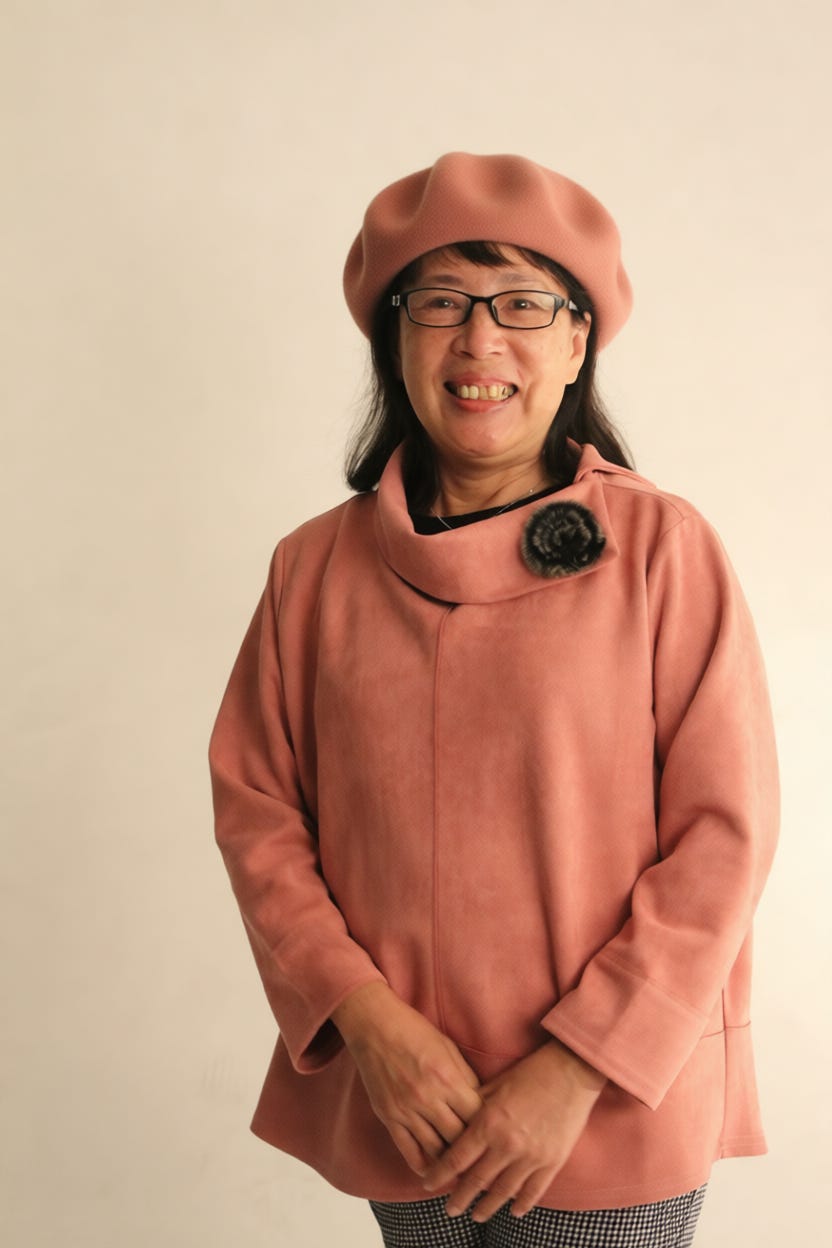 在女士頭上戴上一頂粉橘色(偏豆沙色)貝雷帽,略微向左傾斜。