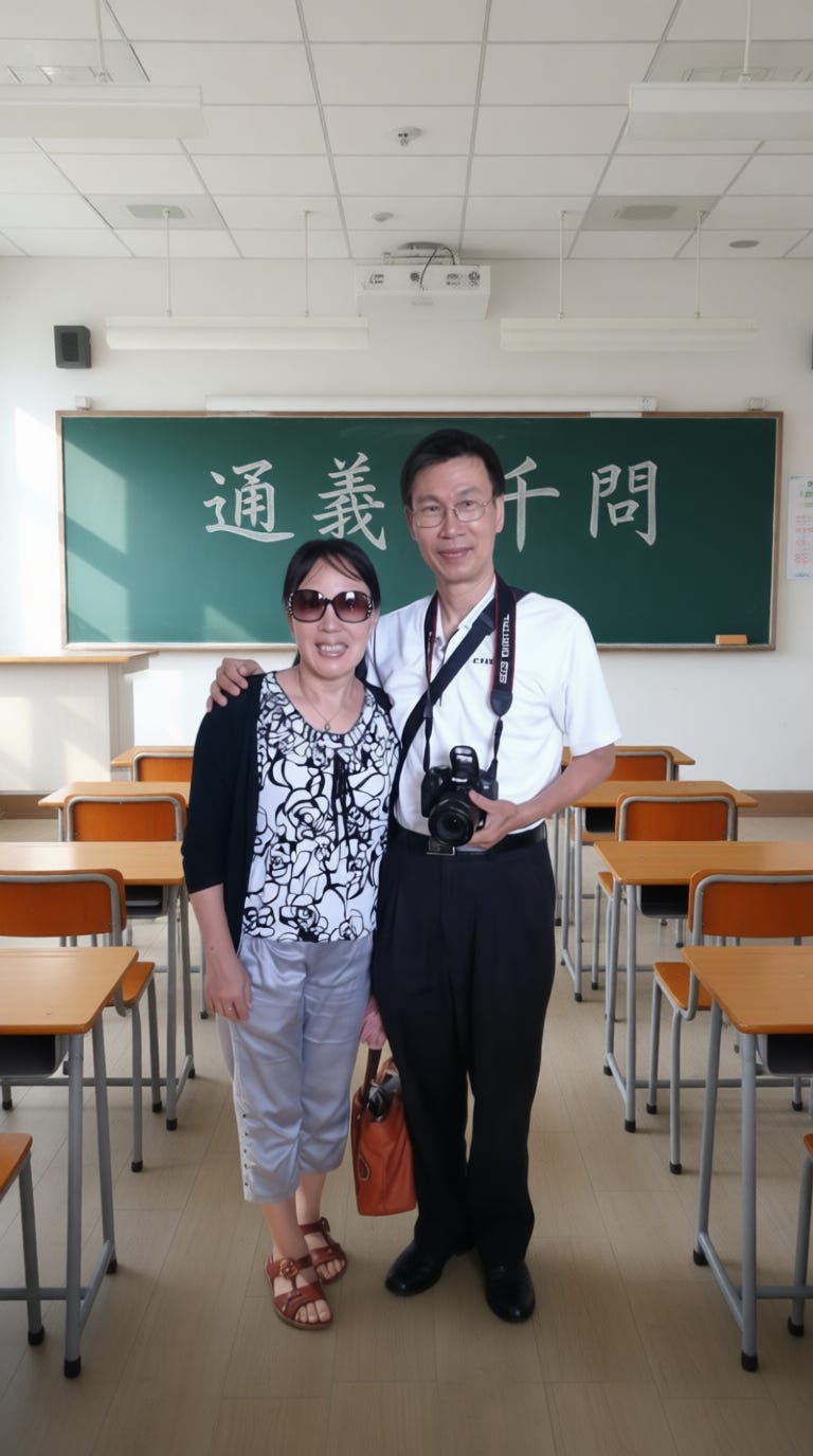 將背景替換為寫實的現代教室場景;在中央放置一塊深綠色或黑色的傳統黑板,並用白色粉筆工整地寫上“通義千問”兩個字。