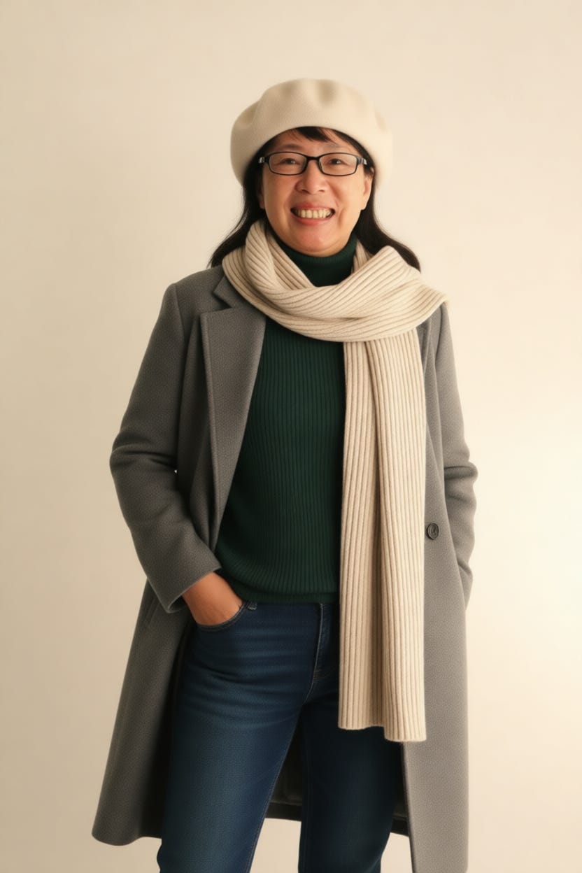 配件:她圍了一條米色條紋圍巾,圍巾的顏色與外套和毛衣形成了溫暖的對比,增添了整體造型的精緻感和層次感,頭上戴上一頂米白色貝雷帽,略微向左傾斜。。