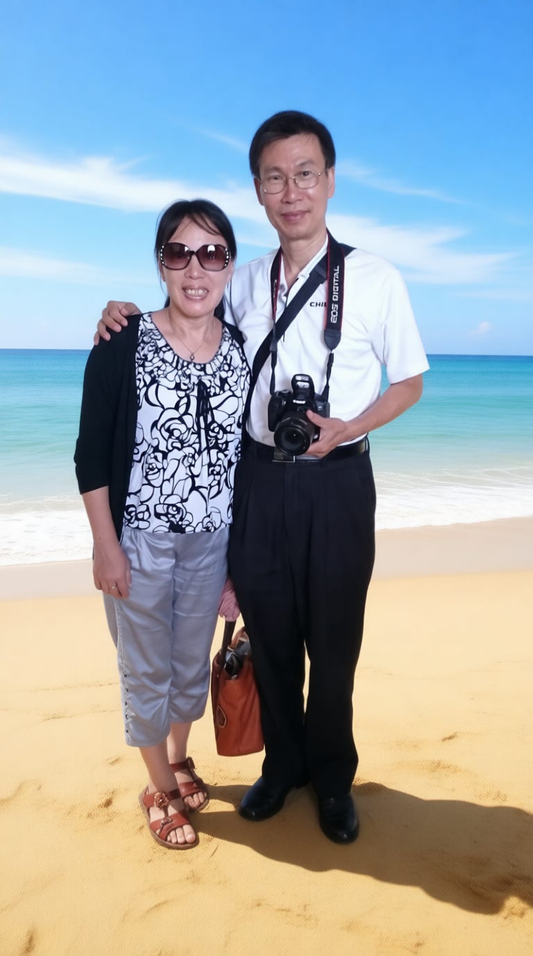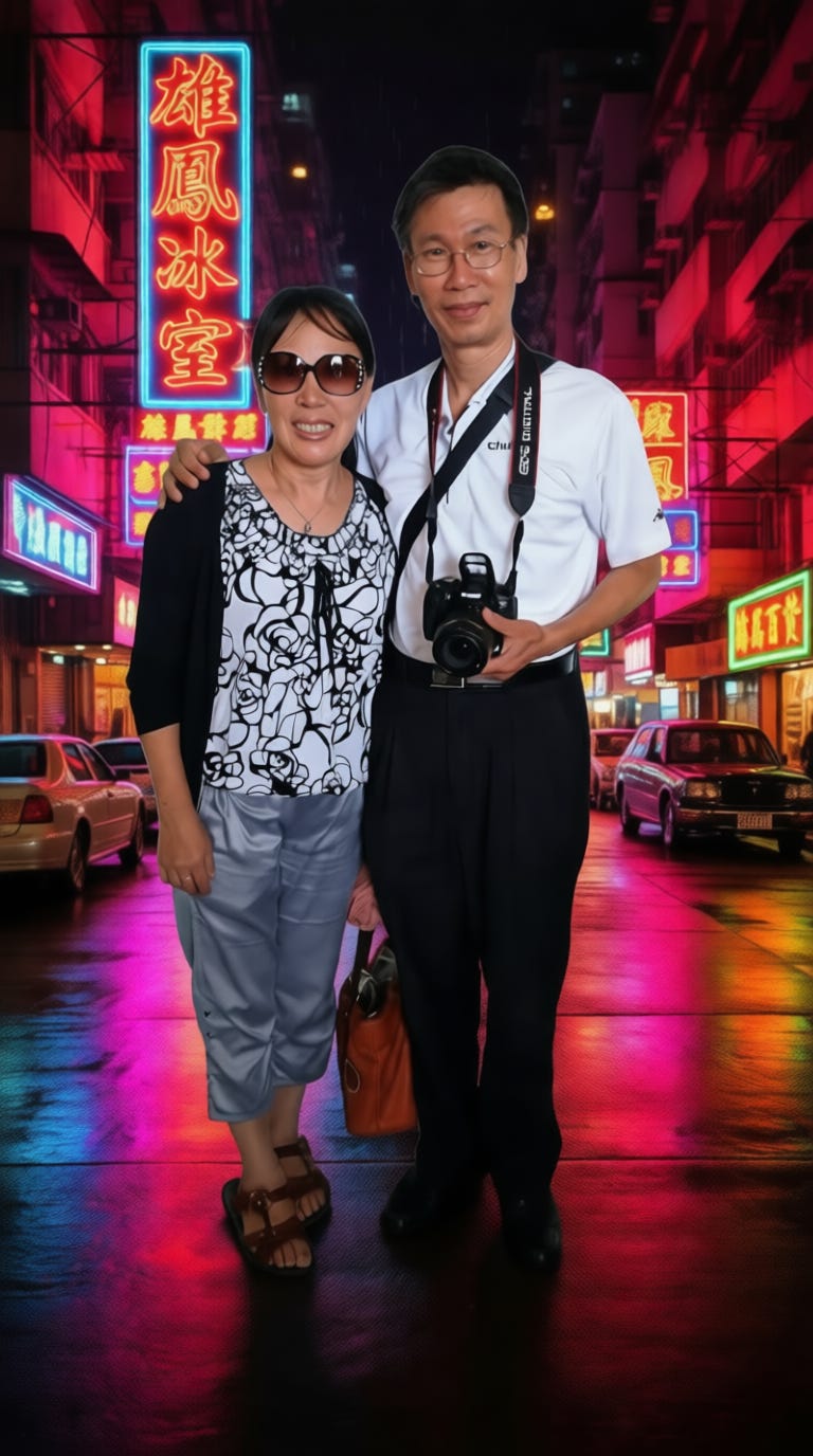 附圖中年情侶維持不變,背景變更為(ㄧ般充满活力且温暖的香港午後霓虹街景,彩色的中英文招牌閃爍著明亮光芒 “雄鳳冰室”、 “雄鳳髮型屋”、“雄鳳舞廳”、“雄鳳百货”、“雄鳳電器“等招牌交織其中·場景生動、電影感十足,地面因雨而濕潤,映出霓虹倒影、色彩鲜艷,充滿粉红、藍、紅與綠色調、建築密集,霓虹招牌層疊交錯·呈現1980年代香港風格、背景為温暖的黃色街道,所有店鋪燈火通明。)