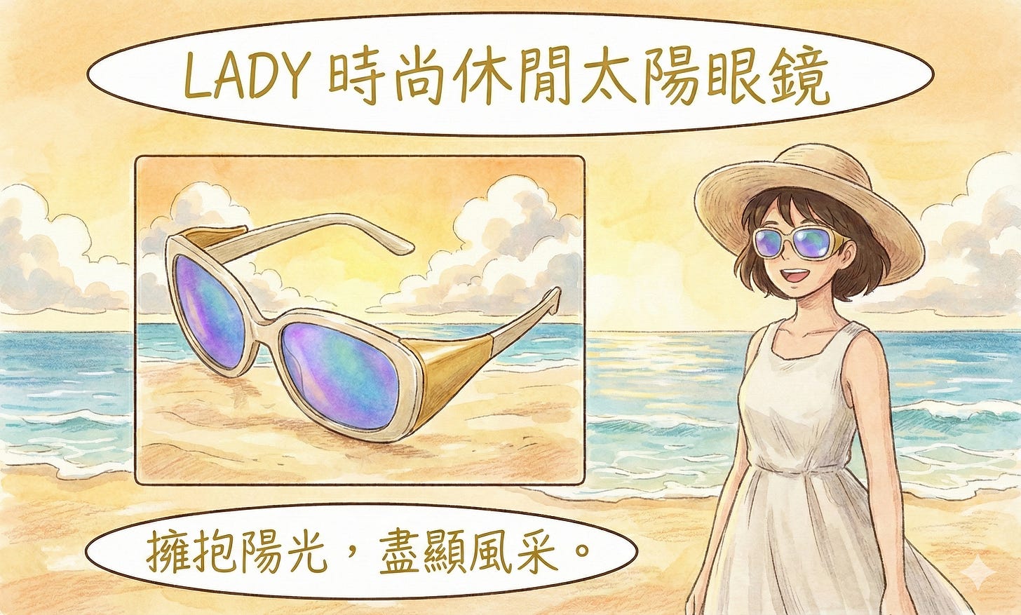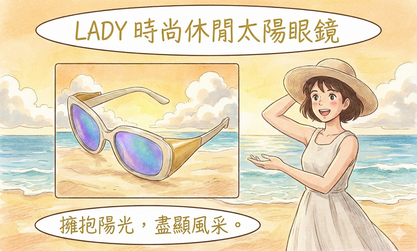 生成圖片:依照附件草圖及眼鏡產品圖,為這”LADY 時尚休閒太陽眼鏡” 的產品, 製作一則時尚休閒太陽眼鏡的廣告。人物使用吉卜力風格。