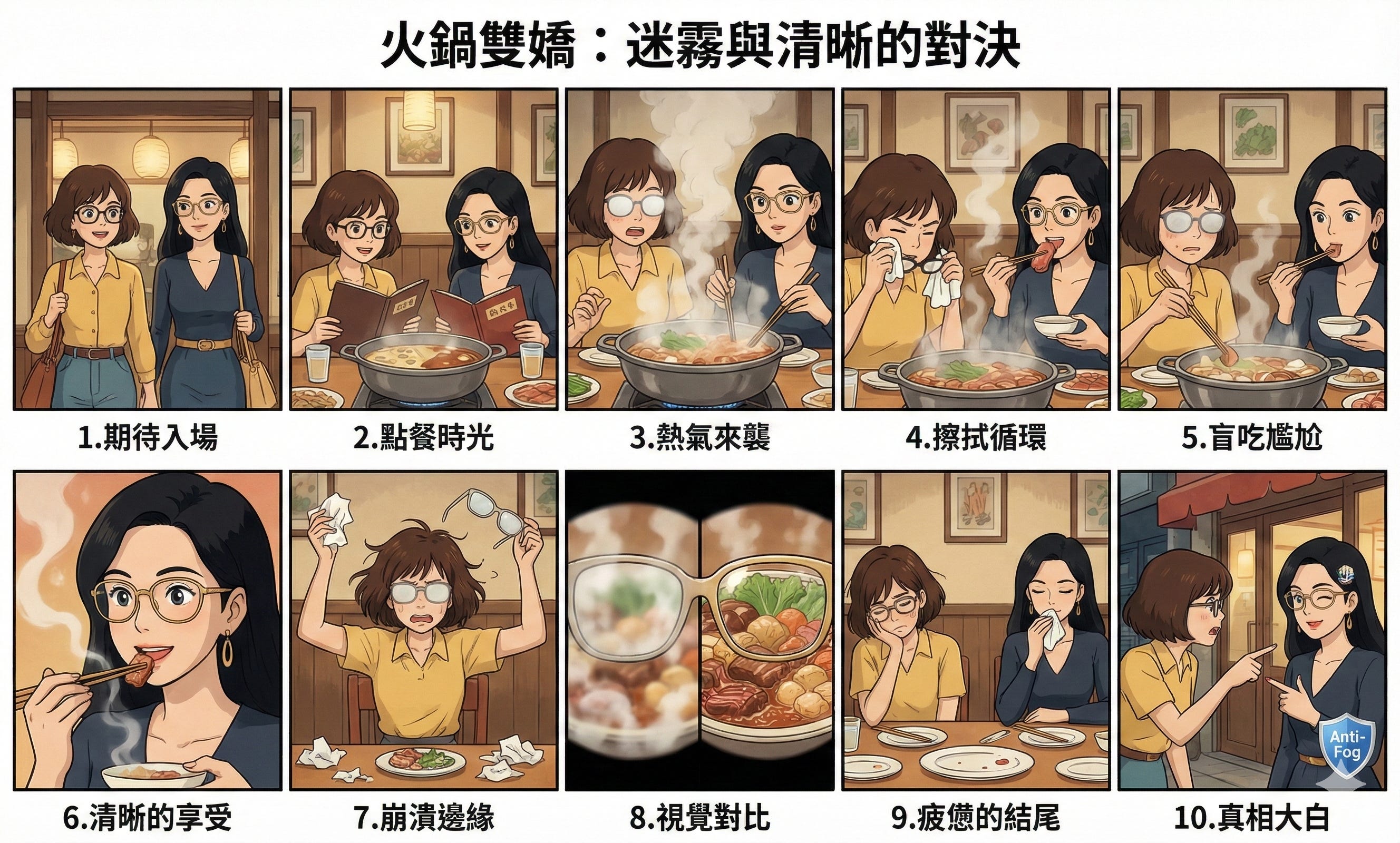 依據附圖之格式生成一張圖片,裡面包含有十個情景的圖片,內容是一個的有趣故事,描述2 位時尚美女相約去吃火鍋,一位戴著有防霧的眼鏡,另一位帶著普通的眼鏡,從開始吃火鍋到結束,一位吃的非常盡歡,但另一位則被火鍋裡的熱氣不停地讓眼鏡沾滿白霧,必須不停地擦拭眼鏡,結果吃得很辛苦,請將此過程表情和各種角度要逼真呈現。