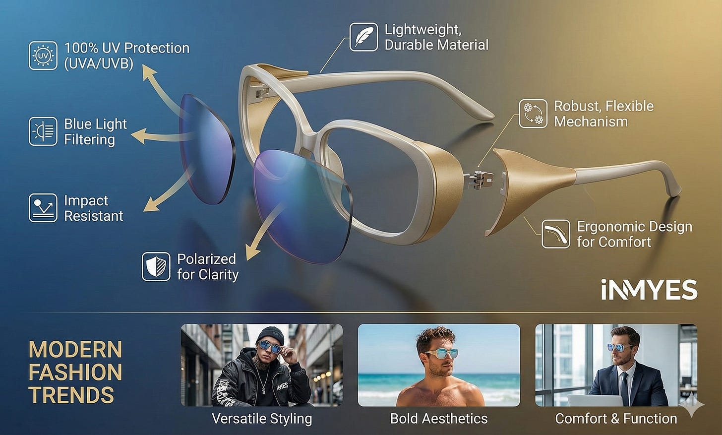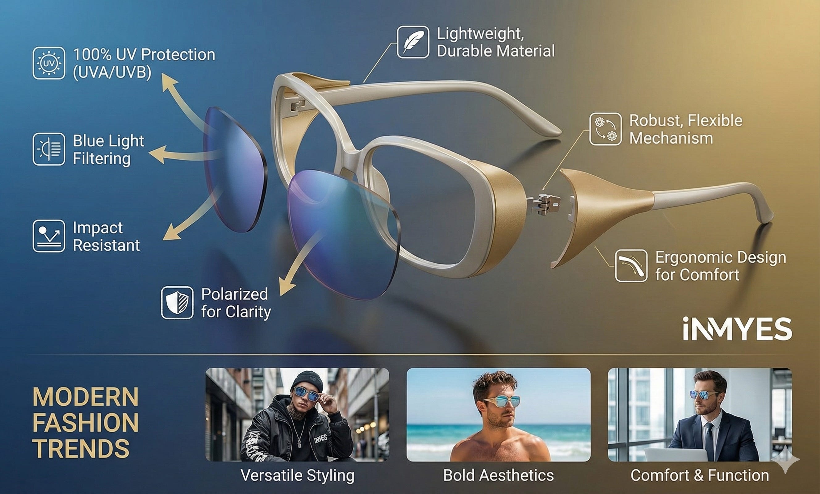 製作一張iNMYES 時尚休閒太陽眼鏡的超寫實資訊圖表,以解構方式展示視覺防護以及符合現代時尚趨勢。