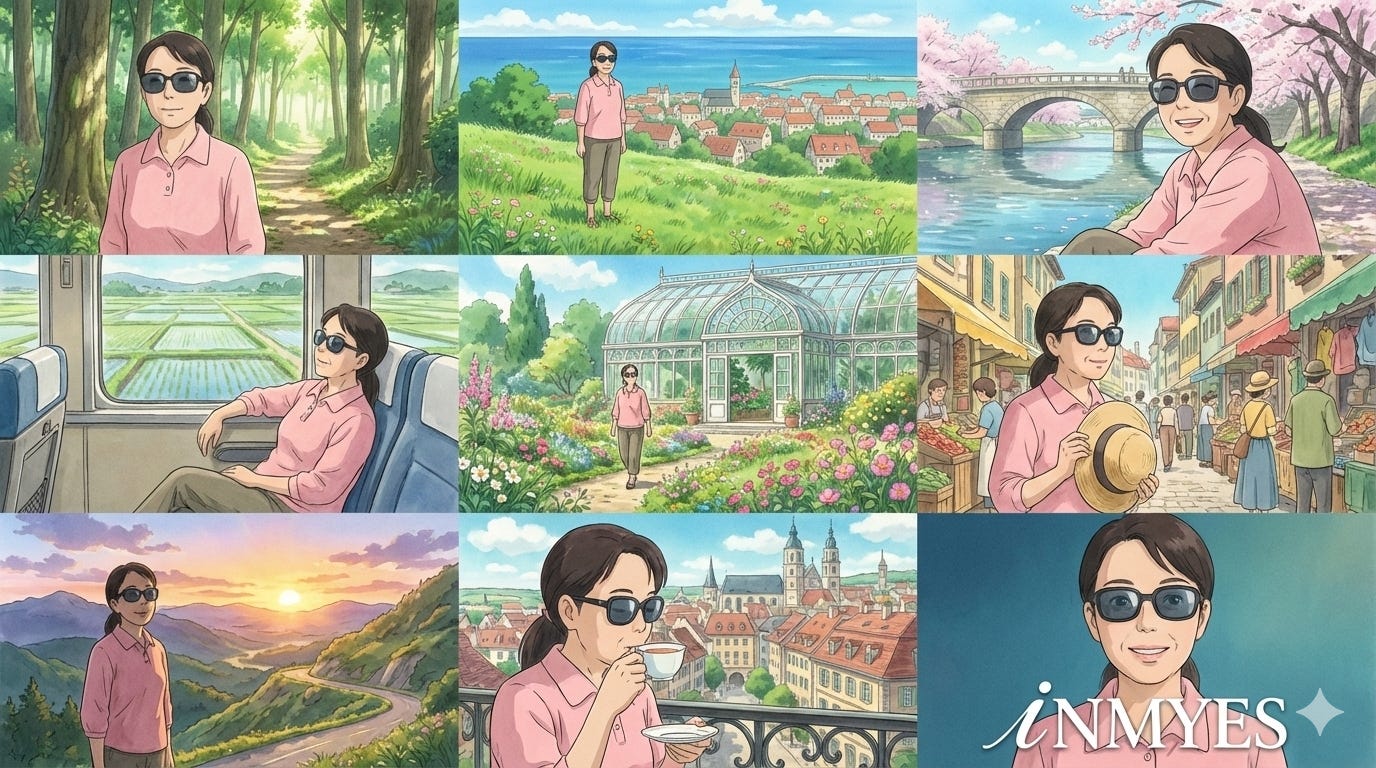 創作一個九宮格裡的 9 張圖片、主角是附圖女性以吉卜力風格呈現,拍攝一支獲獎的時尚休閒太陽眼鏡的廣告。主角在各種有名的景觀下悠遊漫步,閒情逸致,並以女主角與 Logo “iNMYES”的優雅鏡頭作結。女主角的和眼鏡必須全程保持一致,且應從不同角度和距離拍攝。請逐一生成圖片。確保每張圖片皆為 16:9 橫向格式。