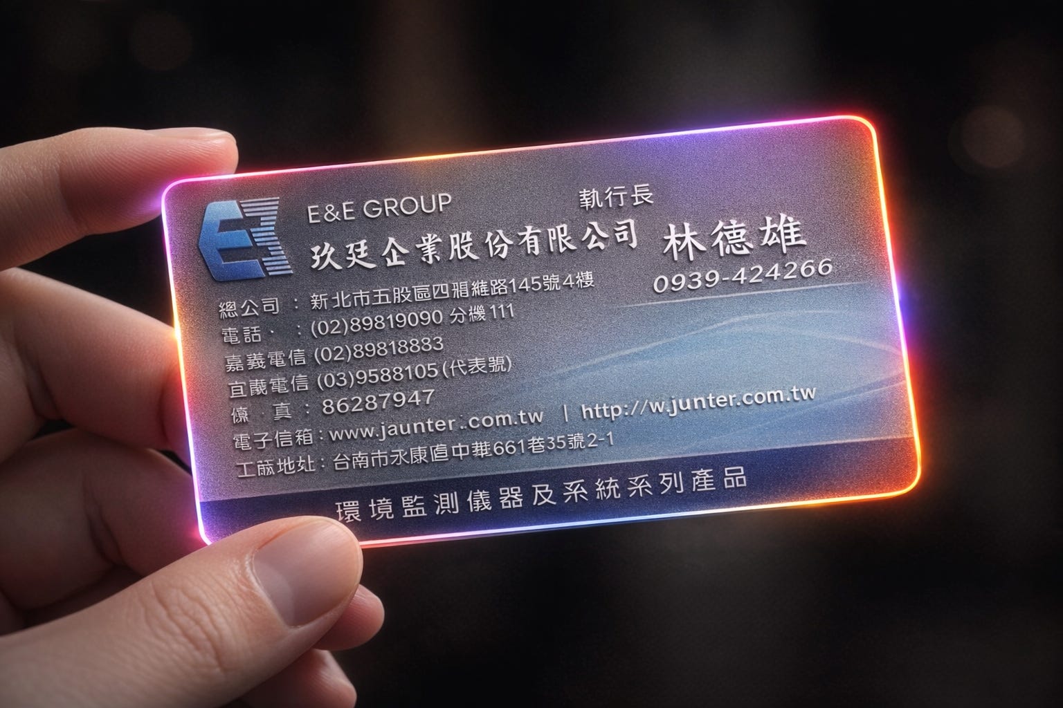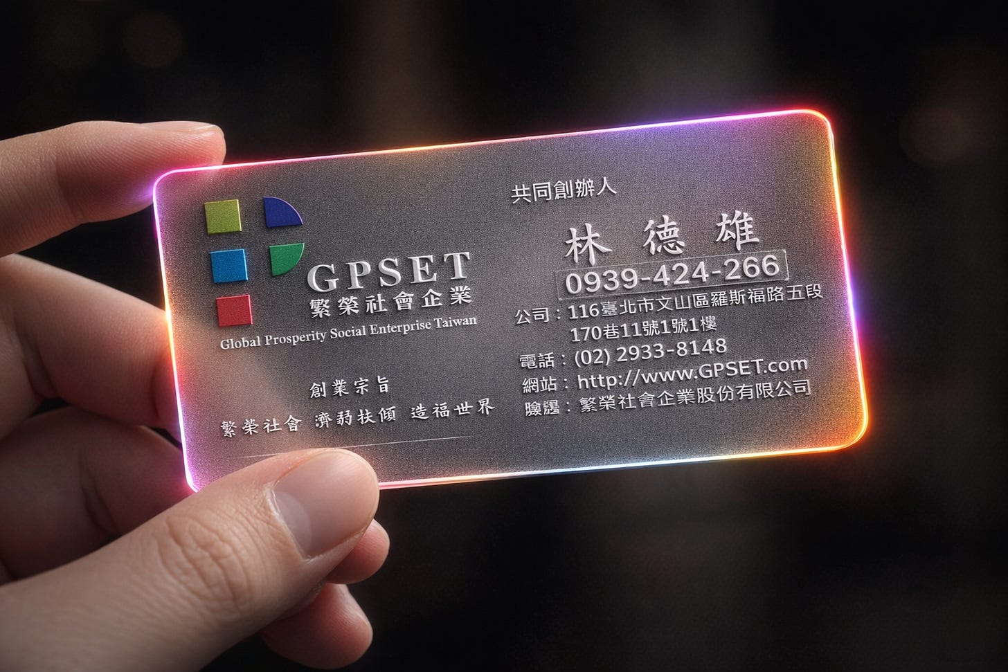 生成一張超寫實的 3D 渲染圖。兩根手指輕輕夾著一張長方形圓角透明名片。卡片材質為高級磨砂亞克力,邊緣環繞著 Threads 標誌性的粉、紫、橘三色漸層螢光。卡片中心以極簡無襯線字體排版繁體中文個人資料,字體呈現精緻的白色浮雕質感。背景為深色調,以突出玻璃邊緣的折射光影。
